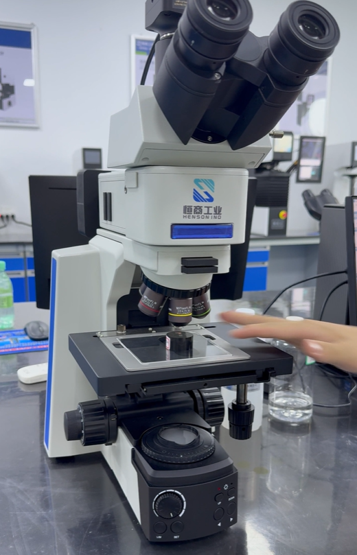 将制备好的样品放在金相显微镜载物台上,通过低倍观察确定组织分布情况,查找是否存在明显缺陷或异常区域。