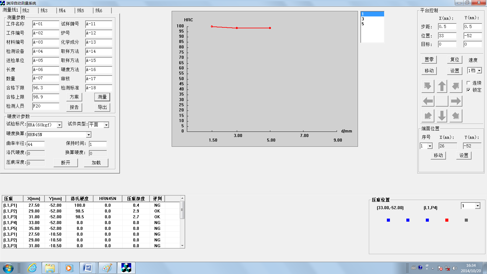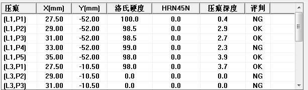 屏幕左下角的数据栏,实时显示测量的试验序号L、压痕序号P、平台位置X、Y、测量结果洛氏硬度、换算硬度HRN45N、压痕深度和判断结果。