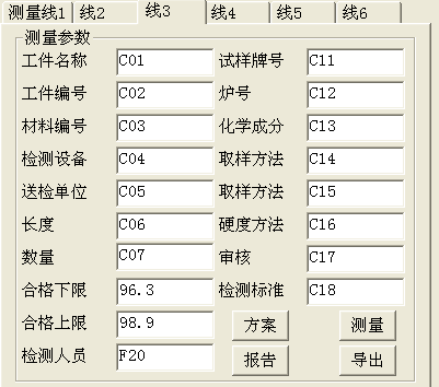 选择不同的试样测量线,对应不同的参数值。如下图,选择了第3根试样,输入C01-C07,C11-C18等参数。这15组参数值,对应了第3根检测试样的参数。而“合格下限”、“合格上限”和“检测人员”,则对应所有的检测试样。